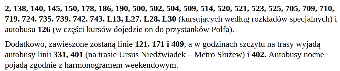 W święto czyli czwartek, 15 sierpnia zarówno autobusy, tramwaje jak i pociągi metra, będą kursować według świątecznego rozkładu. Natomiast nocne autobusy według rozkładu weekendowego. Zawieszone będą linie: 126, 800.