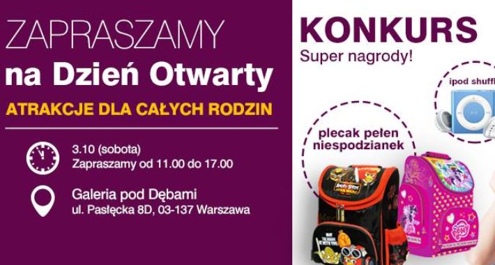 Przyjdź na Dzień Otwarty firmy AMA Consulting i wygraj super nagrody! Organizatorzy przewidują atrakcje dla całej rodziny - konkursy, w których będzie można wygrać plecaki z niespodziankami oraz ipody shuffle. Rodzice będą mogli zapoznać się z nową, atrakcyjną ofertą firmy.
