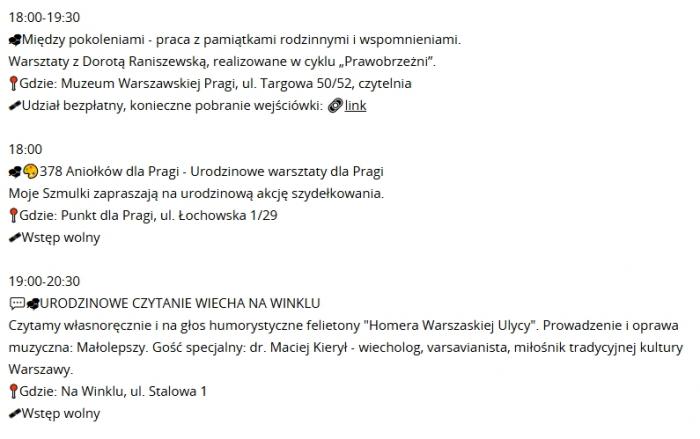 17:00-19:00 - Piosenką przez Pragę - quiz i śpiewy z Czesiem. Organizatorzy: Towarzystwo Przyjaciół Pragi, Towarzystwo Miłośników Historii i Tradycji. Gdzie: Muzeum Warszawskiej Pragi, ul. Targowa 50/52. Zapisy mailowe: [email protected].