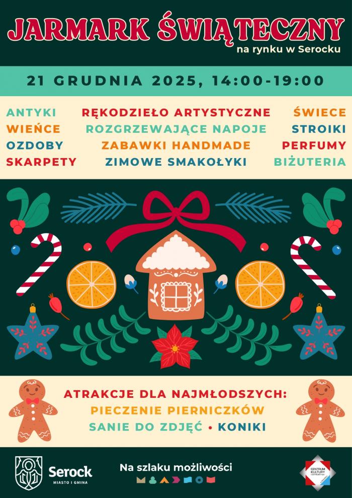 Już 21 grudnia 2025 roku, w godzinach 14:00–19:00, Urząd Miasta i Gminy w Serocku serdecznie zaprasza na wyjątkowy Jarmark Świąteczny, który odbędzie się na serockim Rynku. To niezwykła okazja, aby poczuć magię zbliżających się Świąt Bożego Narodzenia, spotkać się we wspólnym gronie i przygotować do tego wyjątkowego czasu.