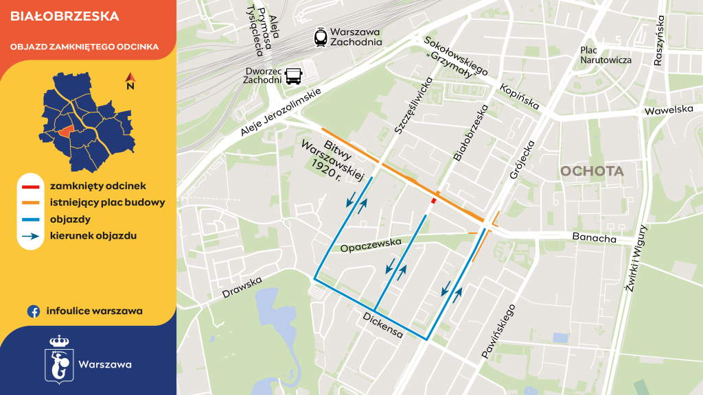 Po zakończeniu tego etapu drogowcy otworzą ulicę Białobrzeską po obu stronach Bitwy Warszawskiej 1920 r., a zamkną wjazd w ulicę Szczęśliwicką w stronę Sokołowskiego „Grzymały”.