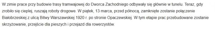 W ramach realizacji inwestycji "tramwaj do Dworca Zachodniego", na noc zamknięta zostanie jedna z ważniejszych ulic Ochoty.