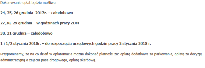 Czas świąteczny to dla wielu urzędów czas wolny, a formalności jakoś załatwić trzeba. W okresie świąteczno-noworocznym możliwe będzie dokonywanie opłat za holowanie pojazdów w opłatomatach znajdujących się w siedzibie ZDM, przy ul. Chmielnej 120.