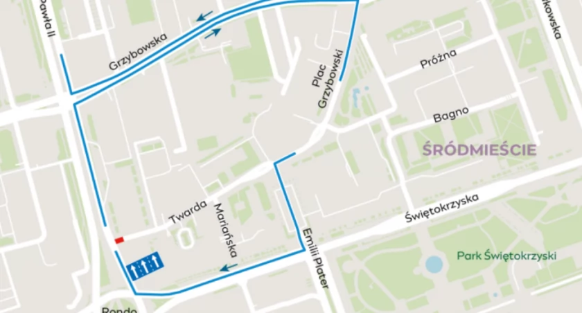 Ulica Twarda od strony Grzybowskiej będzie kończyła się ślepo przed placem budowy. Zamknięty odcinek Twardej można ominąć ulicami Emilii Plater i Świętokrzyską lub Grzybowską.
